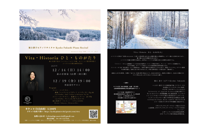 前半はシベリウスが物語を音で紡いだ作品群を、後半は徳山美奈子氏による**祈りの音楽《メメント・モリ》**のピアノソロ版全曲〈世界初演〉をお届けします。